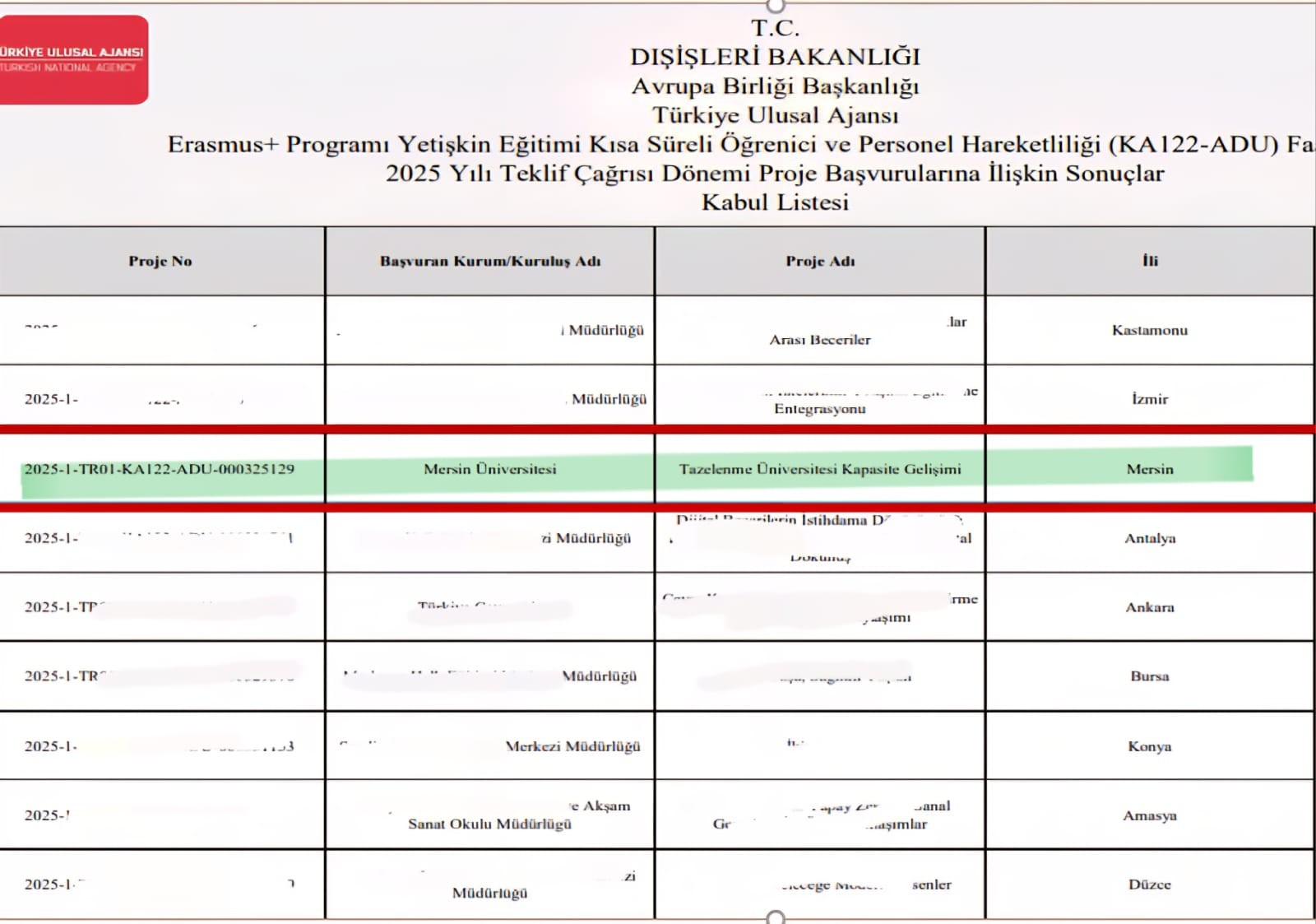 Mersin Üniversitesi Hemşirelik Fakültesi Dekanımız Prof. Dr. Duygu VEFİKULUÇAY YILMAZ'ın Yönetim Kurulu Başkanı olduğu Mersin Üniversitesi 60+ Tazelenme Üniversitesi, Avrupa Birliği Erasmus+ Programı kapsamında Yetişkin Eğitimi Kısa Süreli Öğrenci ve Personel Hareketliliği projesi (KA122-ADU) ile büyük bir başarıya imza attı.