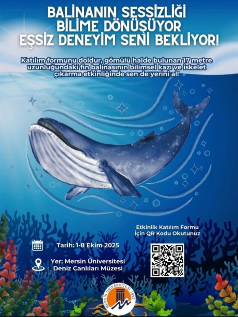 1-8 Ekim 2025 tarihleri arasında Mersin Üniversitesi Deniz Canlıları Müzesi Bahçesi (Yenişehir Kampüsü)’nde yapılacak bu etkinlikte öğrencilerimiz, uzman akademisyenler eşliğinde bilimsel bir kazı sürecine tanıklık edecek, iskelet çıkarma çalışmalarına aktif olarak katılma fırsatı bulacaklardır.