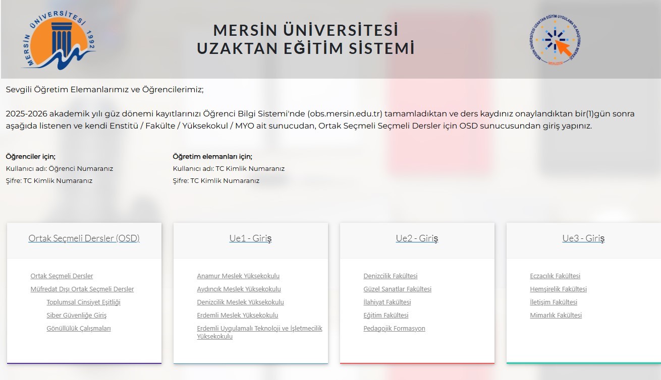 Derslere erişim için ue.mersin.edu.tr adresine giriş yaparak “Ortak Seçmeli Dersler” sekmesini kullanabilir veya doğrudan ue13.mersin.edu.tr adresi üzerinden erişim sağlayabilirsiniz.