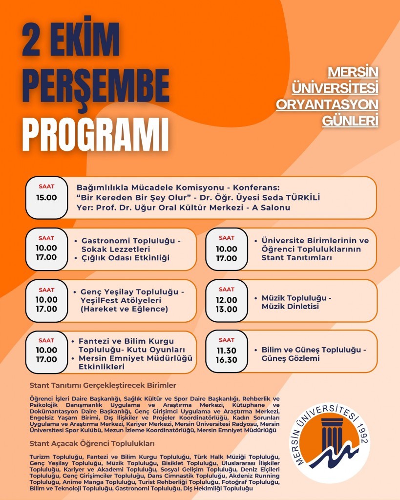 Fakültemize yeni katılan öğrencilerimiz için üniversitemiz tarafından hazırlanan oryantasyon programı 01-03 Ekim 2025 tarihlerinde gerçekleştirilecektir.