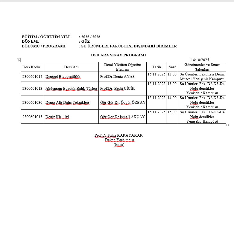 2025-2026 Güz Dönemi Ara Sınav Programı