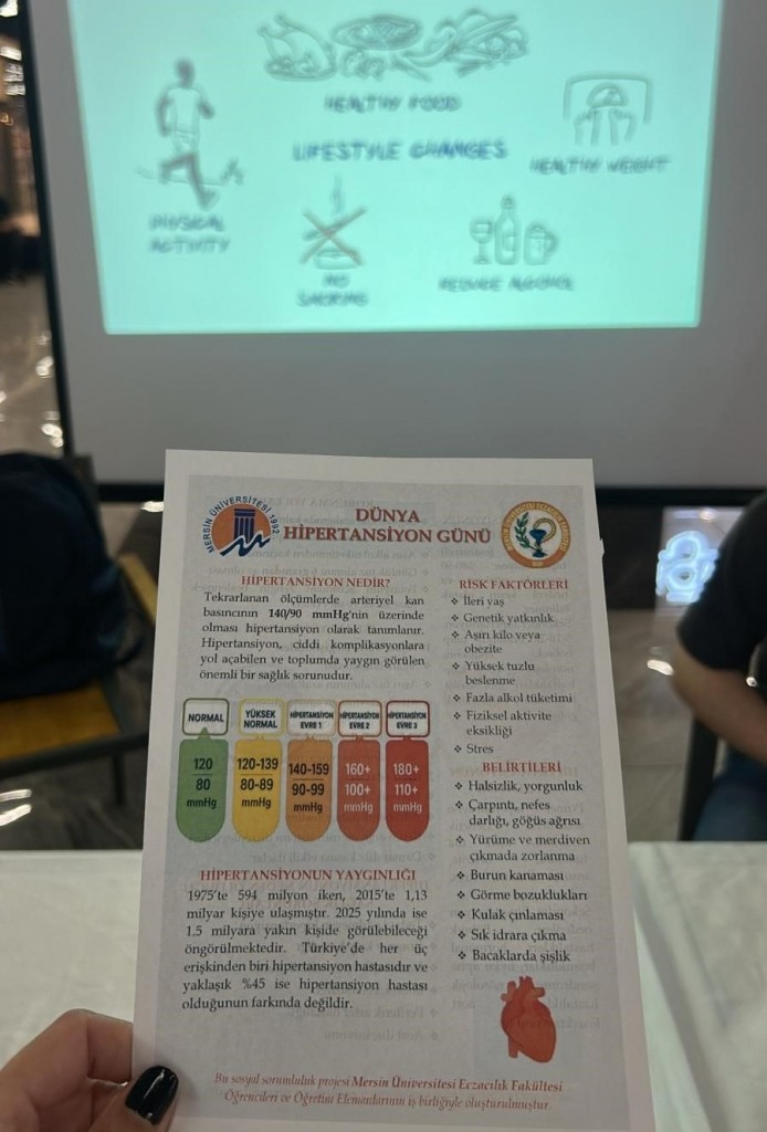 Fakültemiz öğrencileri Sayapark Alışveriş Merkezinde standımızı ziyaret eden bireyleri hipertansiyonun türleri, yaygınlığı, belirtileri, risk faktörleri, neden olduğu sağlık sorunları, korunma yolları ve tedavisi hakkında bilgilendirerek broşür dağıttı. Gerçekleştirilen bu etkinlikte “Dünya Hipertansiyon Günü” kapsamında hastalığa dikkat çekilmiş ve farkındalık sağlanmış oldu.