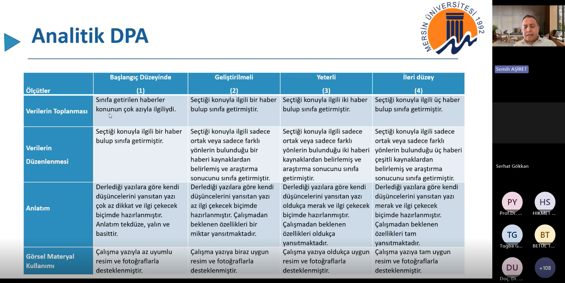 Etkinlikte, eğitimde değerlendirme yaklaşımları, performans değerlendirme araçları, rubrik türleri, rubrik geliştirme aşamaları ve analiz süreçleri hakkında kapsamlı bilgiler paylaşıldı. Ayrıca, Yapay zekâ destekli dereceli puanlama (Rubrik) oluşturmada kullanılabilecek uygulamalar tanıtılarak, bu uygulamalarda rubrik oluşturma adımları ve prompt yazımı konularında örnek uygulamalar sunuldu.