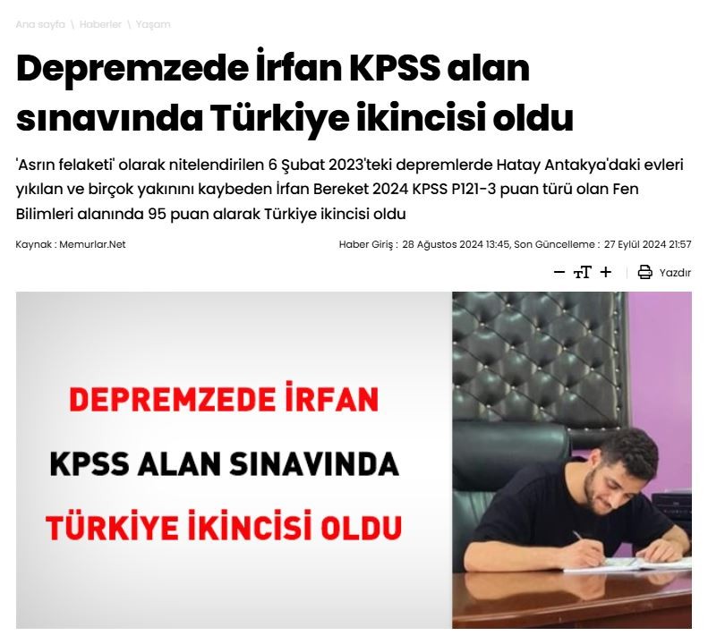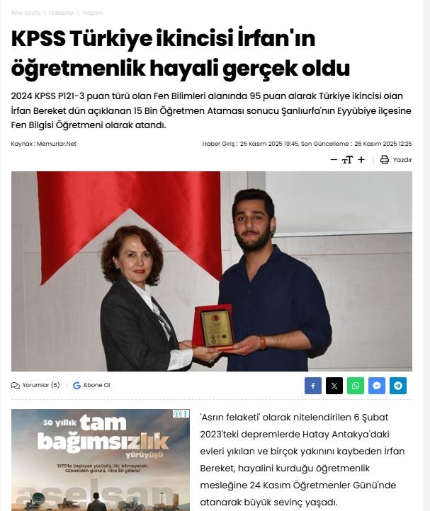Kpss Türkiye İkincisi Mezunumuz İrfan Bereket Şanlıurfa’nın Eyyübiye İlçesine Atandı