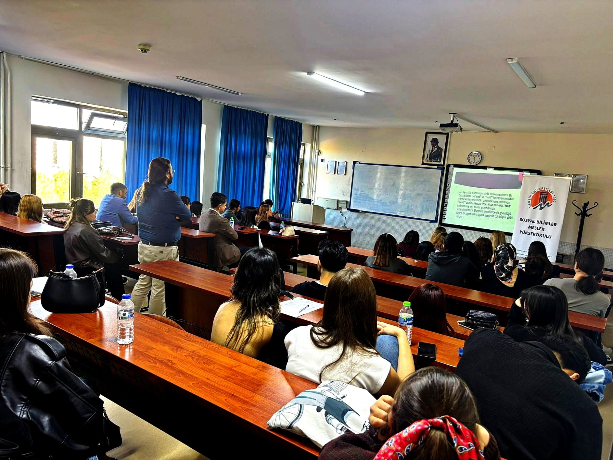 Seminerde “Etkili ve Güzel Konuşma Sanatı” başlığı altında; diksiyon, artikülasyon, ses tonu kullanımı, vurgu, beden dilinin iletişimdeki rolü ve profesyonel temsil becerileri üzerine kapsamlı bilgiler paylaşıldı. Etkili iletişim becerisinin; mesleki temsil gücünü artırması, öğrencilerin iş yaşamında profesyonel bir duruş sergilemesine katkı sunması ve çalışma hayatındaki başarının ana unsurlarından biri olması nedeniyle büyük önem taşıdığı vurgulandı. Özellikle büro hizmetleri, sekreterlik ve yönetici asistanlığı gibi alanlarda doğru, akıcı ve anlaşılır konuşmanın iletişim kalitesini doğrudan etkilediği belirtildi.